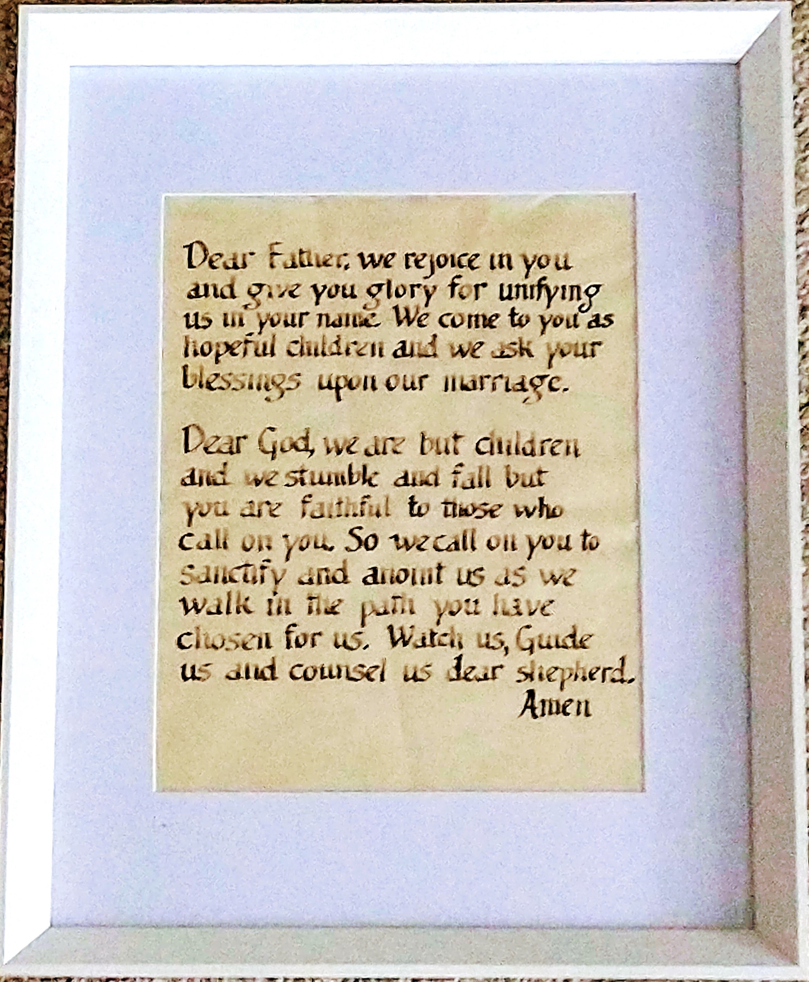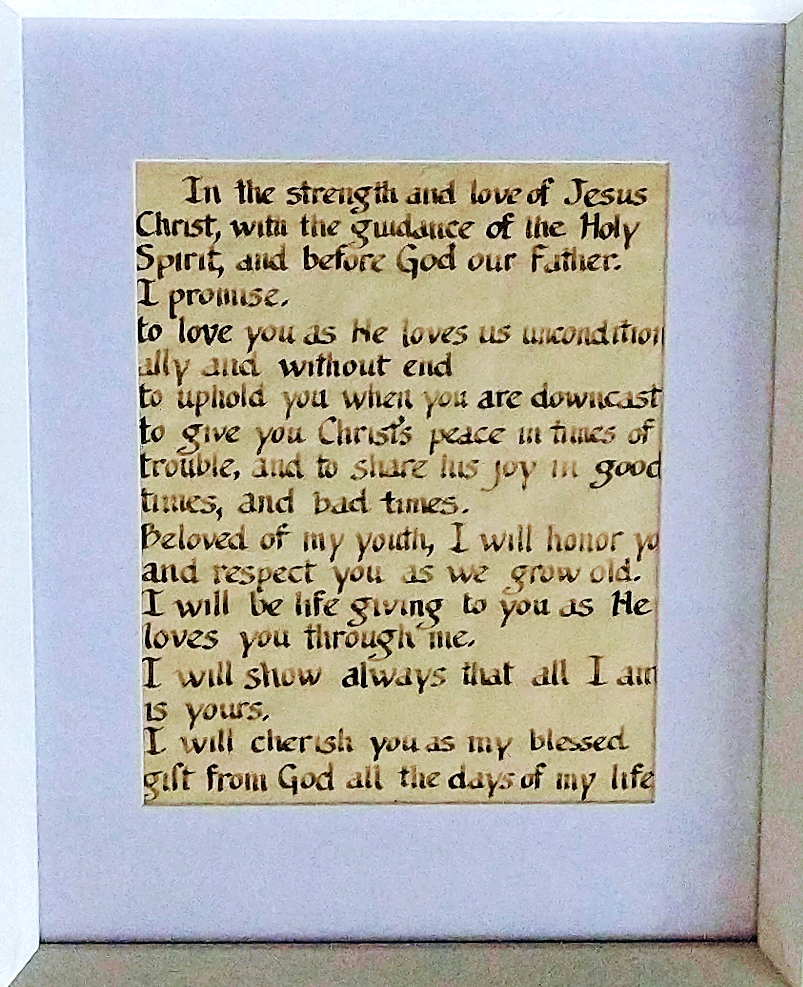 For our first anniversary, I had our prayers and vows calligraphed on paper. For 35 years, these have been on our walls in our bedrooms wherever we have lived.